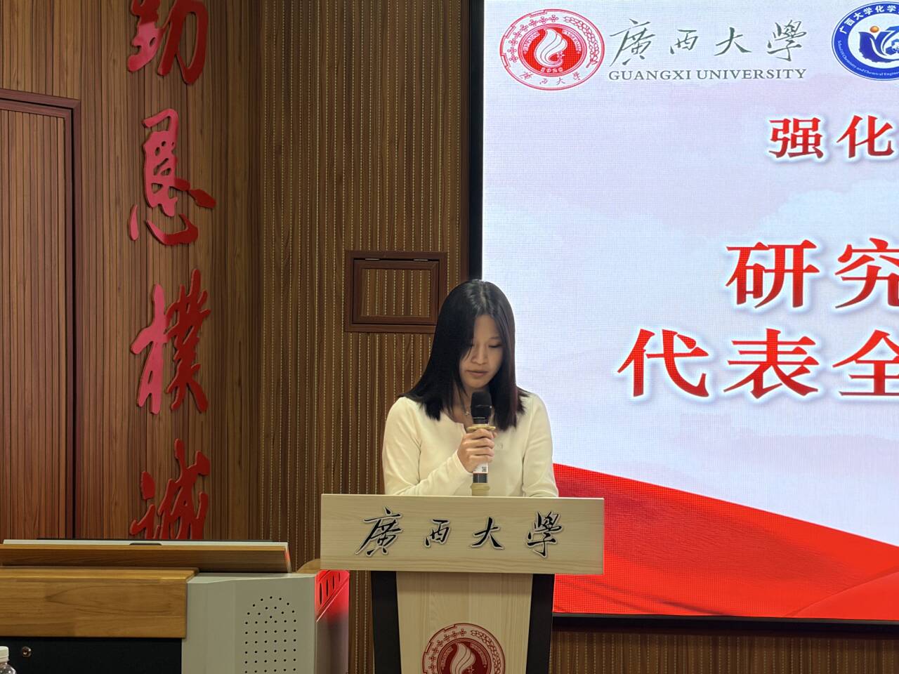 随后,研究生会主席团成员蒋静作表态发言。她表示,将以“归零”心态投入学习,以“实干”精神推动成果转化,以“团结”之力共创佳绩,切实提升履职能力,为学院研究生工作贡献力量。