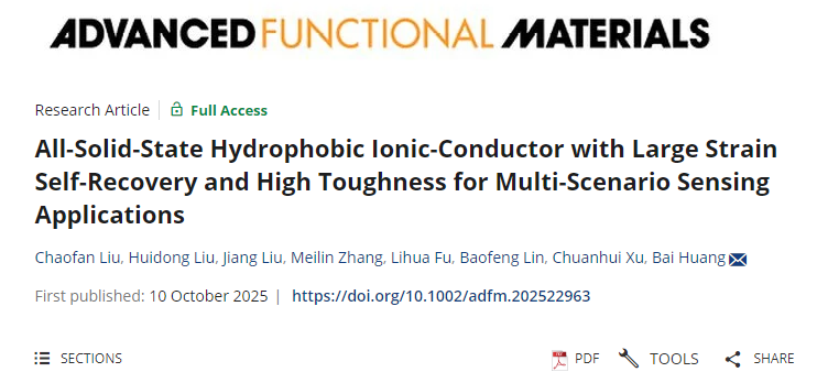 近日,2023白菜网站注册大全“先进高分子功能复合材料团队”在柔性多功能传感材料领域取得新进展,相关成果以All-Solid-State Hydrophobic Ionic-Conductor with Large Strain Self-Recovery and High Toughness for Multi-Scenario Sensing Applications为题,发表于国际顶级材料综合期刊Advanced Functional Materials。该论文以2023白菜网站注册大全化学工程与技术2023级硕士生刘超凡为第一作者,黄柏助理教授为通讯作者,2023白菜网站注册大全为唯一通讯单位。