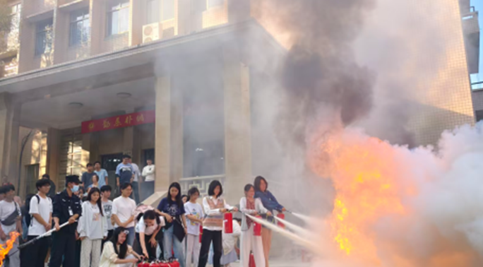 培训中,校保卫处黄光电老师结合高校典型火灾案例,系统讲解了常见灭火器具的分类、使用场景及火场逃生要点,并现场演示了干粉灭火器“提、拔、压”的操作流程。在随后的实操环节,学生们分批参与了模拟火场疏散与灭火器实操训练,在动手实践中进一步掌握了消防技能。